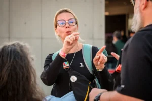Suncica, a Deaf volunteer with the IMB, shares the gospel with two North American Deaf in line to see a volleyball match at the 2025