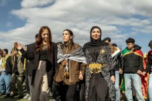 Women link arms as they walk in a parade for Nowruz, a festival marking the Persian New Year. This festival holds deep significance for them,