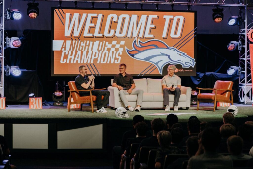 Denver Broncos’ Quarterback Bo Nix and his father, Coach Patrick Nix, sit down with Lead Pastor Chris Dixon during Night of Champions at First Baptist Church in Bentonville. Dixon led the discussion, asking faith, family, and sports related questions of both. (FBC Bentonville)