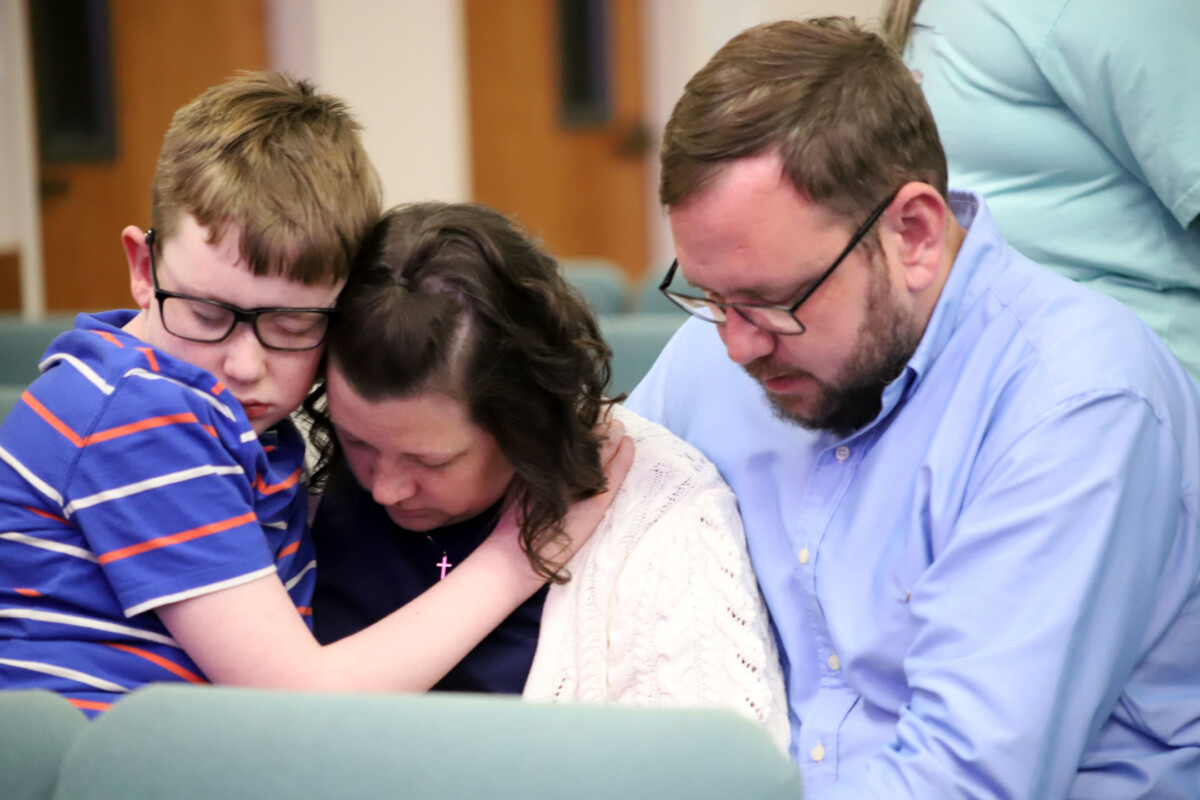 Chris and Jordan Drye pray with their son, Landen, at Sunday evening’s prayer gathering. (Staff photo by Mary Alford) WHITE HALL, Ark. – For the